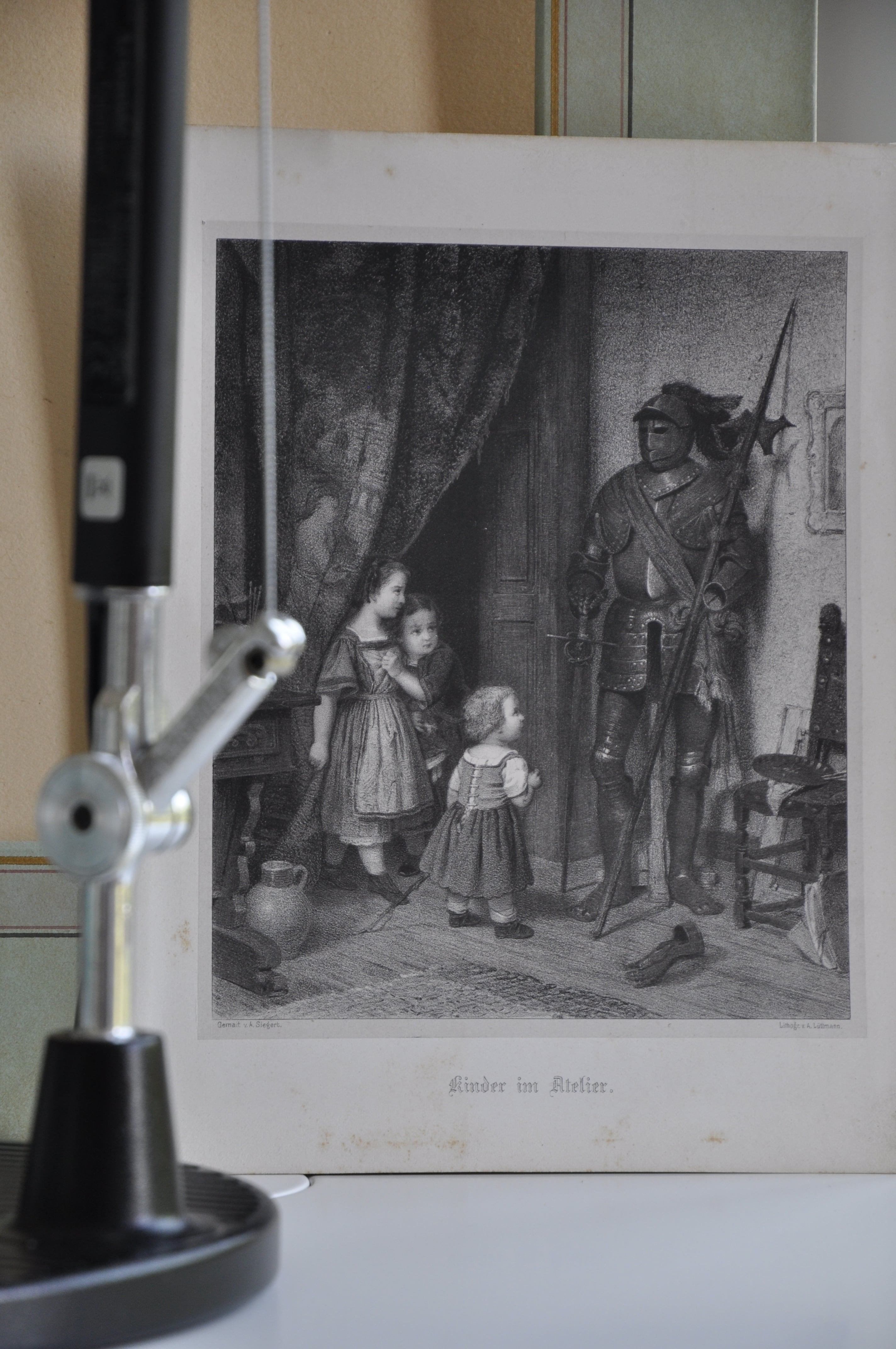 Als Fotograf arbeite ich ähnlich. Jedes Bild ist ein Zitat und eine Variation von etwas, das es gibt. In der Serie Featuring die Ritterrüstung spinne ich diesen Faden weiter, indem ich Gemälde von Siegert in einem heutigen Umfeld fotografiere. Der Bildaufbau wird in die Gegenwart überführt und die Bilder unter Aspekten unserer Zeit neu gesehen. Jetzt sind die Bilder von Friedrich August Siegert Zitate und helfen, neue Bilder zu kreieren: Der Stuhl auf einer Radierung formiert sich mit dem Foto einer Stuhllehne zu einer neuen Sitzgruppe, ein Blumenmädchen verschmilzt mit dem floralen Bezug eines Polstermöbels und ein Schnapstrinker prostet Gläsern zu.