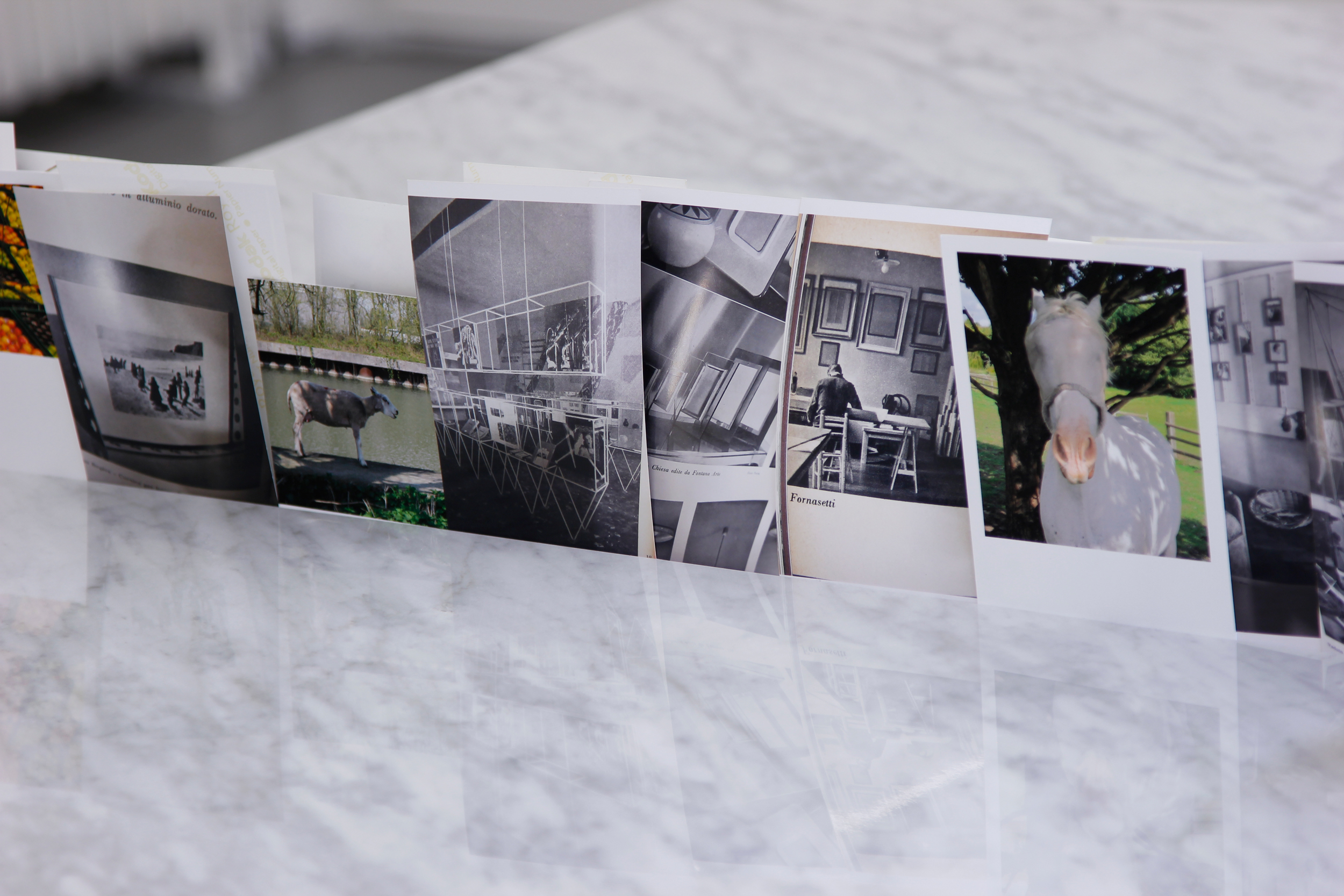 Die Arbeit Fornasetti, Carrara-Marmorplatten mit verschiedenen fotografischen Erzeugnissen bestückt, betont das Interesse des Künstlers an der skulpturalen Qualität der Fotografie. Die Tischarbeit stammt aus 2012 und umkreist mittels Display in Tischform und Fotografien im Postkartenformat das Thema des Display selbst, aber auch der Rahmung und Präsentation, sowie der Kunst als Dekoration im Alltagsbereich. Der italienische Maler, Bildhauer, Kunsthandwerker und Innenarchitekt Piero Fornasetti (1913-1988) befindet sich auf einer der schwarzweissen Abbildungen, am Schreibtisch arbeitend, umgeben von u.a. leeren Bilderrahmen an der Wand. Weitere Abbildungen zeigen ein Bild Holbeins auf einer 50er Jahre Minibar, Carlo Rava als Deckengemälde, oder aber eine Rückenansicht einer Nippskulptur des Frühlings von Botticelli. Dazu kommen Aufnahmen von verschiedenen leeren Rahmen, von Rahmen-Hinteransichten und von weiteren speziellen Präsentationsansichten von Bildern. Die schwarzweiss-Aufnahmen stammen aus italienischen Einrichtungszeitschriften, die der Künstler rudimentär beim Durchblättern abfotografierte. Daher stammen auch die perspektivischen Verzerrungen und das Lichtspiel. Dazwischen befinden sich ausgewählte Farbaufnahmen in der Ästhetik von Polaroids, was wiederum vom Künstler als Skizzen bezeichnet werden und u.a. auch für die Überfülle an täglich generiertem Fotografien stehen (Facebook, Flickr, Instagram etc.). Die Rückseiten der Bilder sind gewollt sichtbar und verweisen auf die bereits wieder veraltete Massenherstellung von Abzügen über Kodak („press the buttom, we do the rest“ als Werbespruch von Kodak). Das Material des Carrar-Marmors ist kunsthistorisch stark konnotiert und erinnert in der Form eines Tisches an die Repräsentation von Design und steht gleichermassen für die Kunst im Dialog (Ping-Pong).